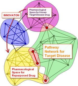 If you are looking for openings in this field each such published patent application speaks of a missed opportunity: “Hey, I might have had this idea myself!” – Never mind that; the intersection of unmet need space in medicine and the unexploited pharmacological potential of known compounds will not be exhausted for many years to come. As you might remember from some of my earlier ramblings here, we believe intelligent prior art search in our own focused databases and exhaustive text analysis – in conjunction with know-how in drug development – to provide as a distinctive edge in drawing up concepts for drug repurposing. The figure illustrates one potential embodiment of this strategy.